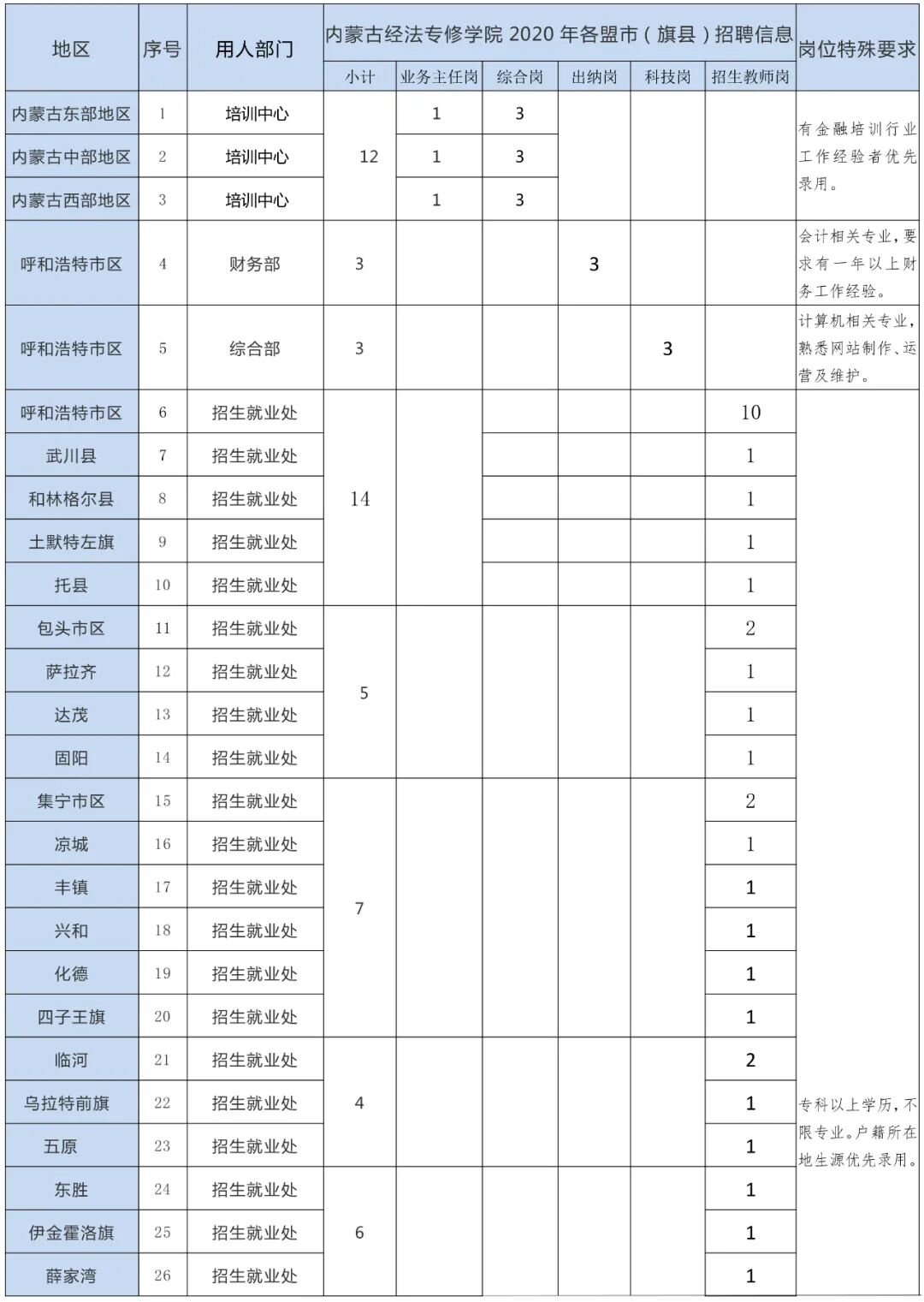 内蒙古经法专修学院2020年公开招聘教师岗位需求汇总表