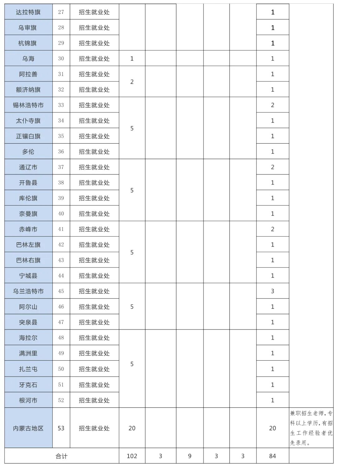 学院依据业务发展,共计招聘102人。其中:业务主任岗3人,综合岗9人,出纳岗3人,科技岗3人,其他岗84人(详见岗位需求汇总表)