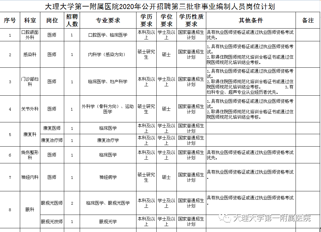(1)报考人员可根据所学专业、学历等按照大理大学第一附属医院所需岗位的招聘条件进行报名,每人限报考一个岗位。