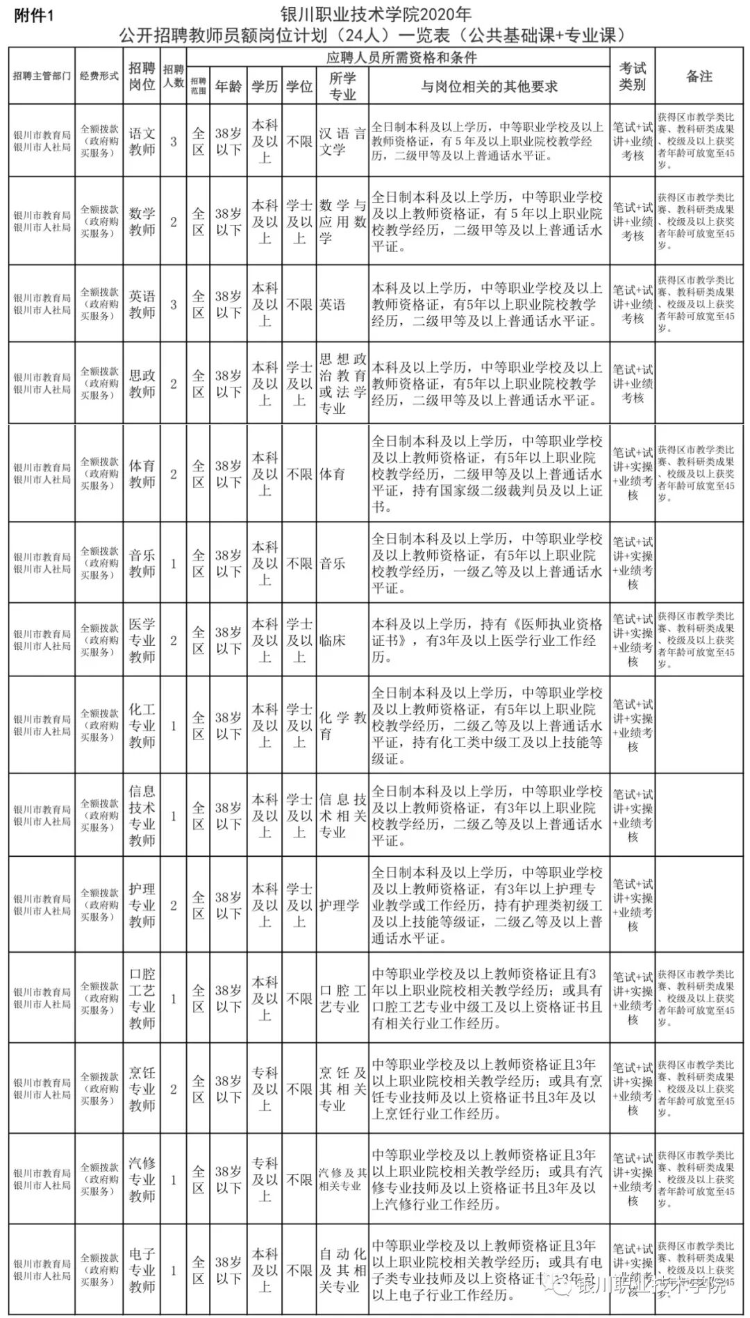 2020年银川职业技术学院公开招聘教师员额24名,具体范围、条件等详见《银川职业技术学院2020年公开招聘教师员额(政府购买服务)岗位计划一览表》(附件1)。