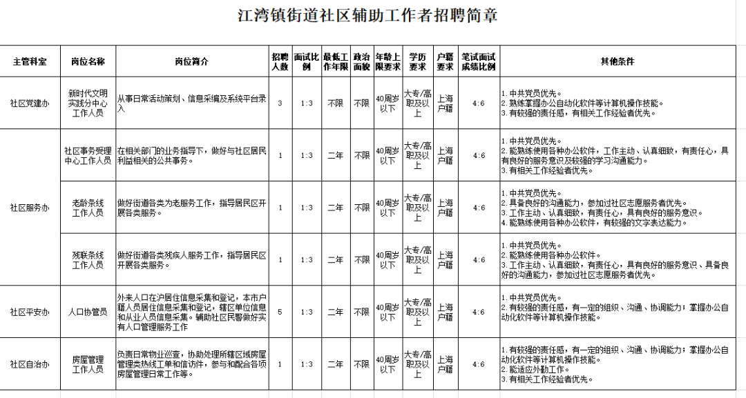 岗位要求和报考条件详见《江湾镇街道社区辅助工作者招聘简章》。