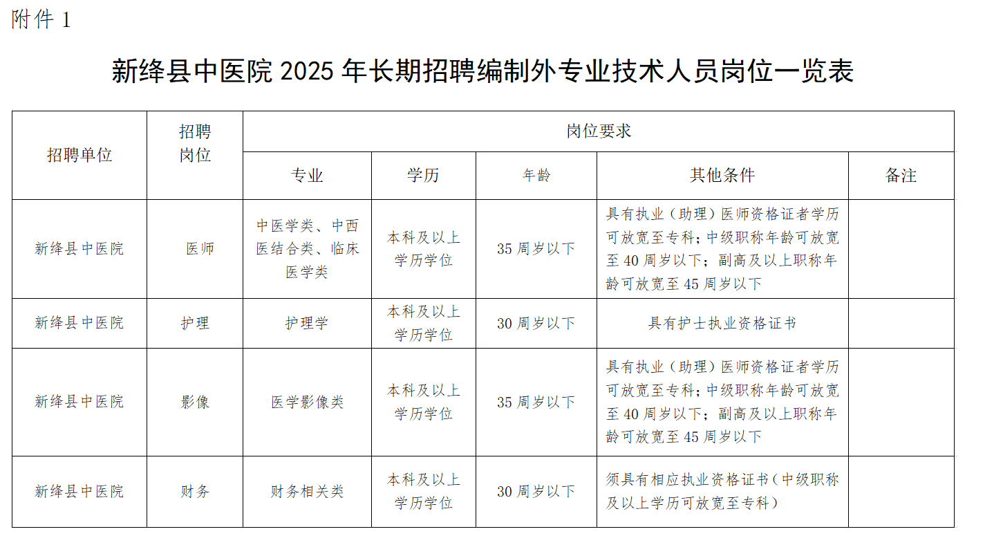 具体招聘岗位详见附件1《新绛县中医院2025年长期招聘编制外专业技术人员岗位一览表》。