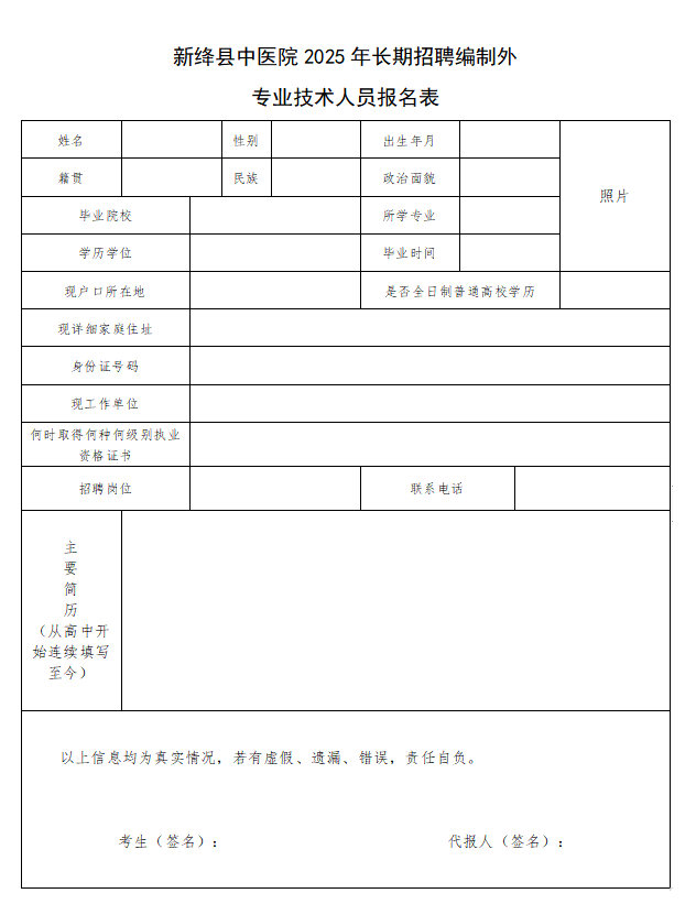 ①《新绛县中医院长期招聘编制外专业技术人员报名表》1份(附件2);