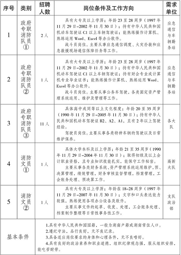 消防救援队伍承担着防范化解重大安全风险、应对处置各类灾害事故的职责使命,实行24小时驻勤备战模式,工作任务重、压力大、专业性强,为不断提高队伍保障水平,进一步加强人才队伍建设,依据《中华人民共和国消防法》《中华人民共和国劳动法》等有关法律规定以及《湖南省专职消防队伍管理办法》《益阳市消防救援支队政府专职消防员招录办法(试行)》等有关文件精神,现面向社会公开招录政府专职消防员16人:政府专职消防队员14人(其中退役士兵不低于40%)、消防文员2人。现将有关事项公告如下:
