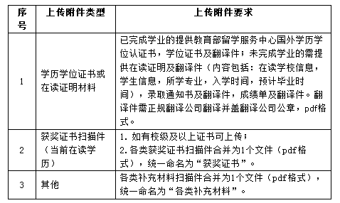 3.上传应骋附件材料。应聘毕业生通过招聘平台及时、规范上传个人应聘附件材料,上传附件数量般不超过7个。应聘毕业生应确保应聘材料能正常打开、清晰显示,因应材料不能正常打开、图像不清晰或未按规范要求填报将影响简历筛选结果。上传附件清单如下: