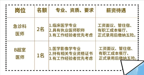 为满足业务发展需求,推进我院医疗高质量发展,加强人才队伍建设,预面向社会公开招聘一批专业技术人才,有关事项公告如下: 面试咨询地址:神木市锦界镇开发区医院 门诊楼一楼耳鼻喉科门诊 咨询电话:(刘院长)13227999930