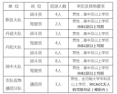 (四)学历技能条件。战斗员、驾驶员要求高中及以上学历,驾驶员要持B2及以上驾照,能够熟练驾驶相应车辆;通信员大学专科以上学历,持CAAC无人机驾驶员证(视矩内)。