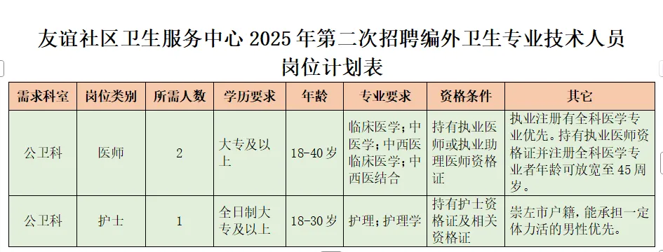 崇左市江州区友谊社区卫生服务中心位于崇左市花山路,是崇左市新城区一所非营利性政府办城市社区医疗卫生服务机构,辖区常住人口约4万余人,中心主要承担辖区居民的基本医疗和基本公共卫生服务。为进一步优化中心卫生人才队伍结构,加强人才队伍建设,以及促进社区卫生服务中心服务能力建设健康发展,结合中心实际业务发展需要,决定面向社会公开招聘3名编外聘用卫生专业技术人员。具体招聘事宜如下: