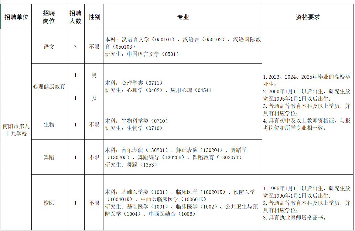 附件:南阳市第九十九学校公开招聘教职工职位表
