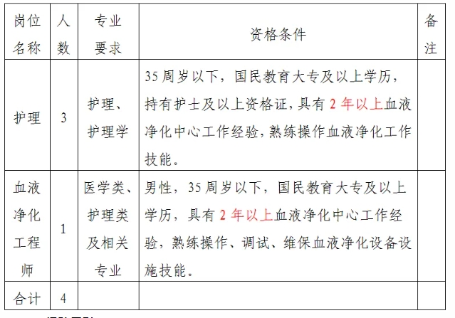 此次招聘为血液净化中心特需(编外)工作人员,采取面试及考核方式进行,择优录用。