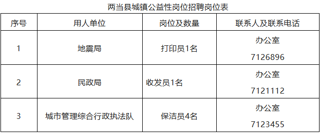 2.报名方式:报名人员直接到用人单位咨询报名。(联系电话见招聘表);报名人员请将《两当县城镇公益性岗位申请表》送到人社局410办公室。