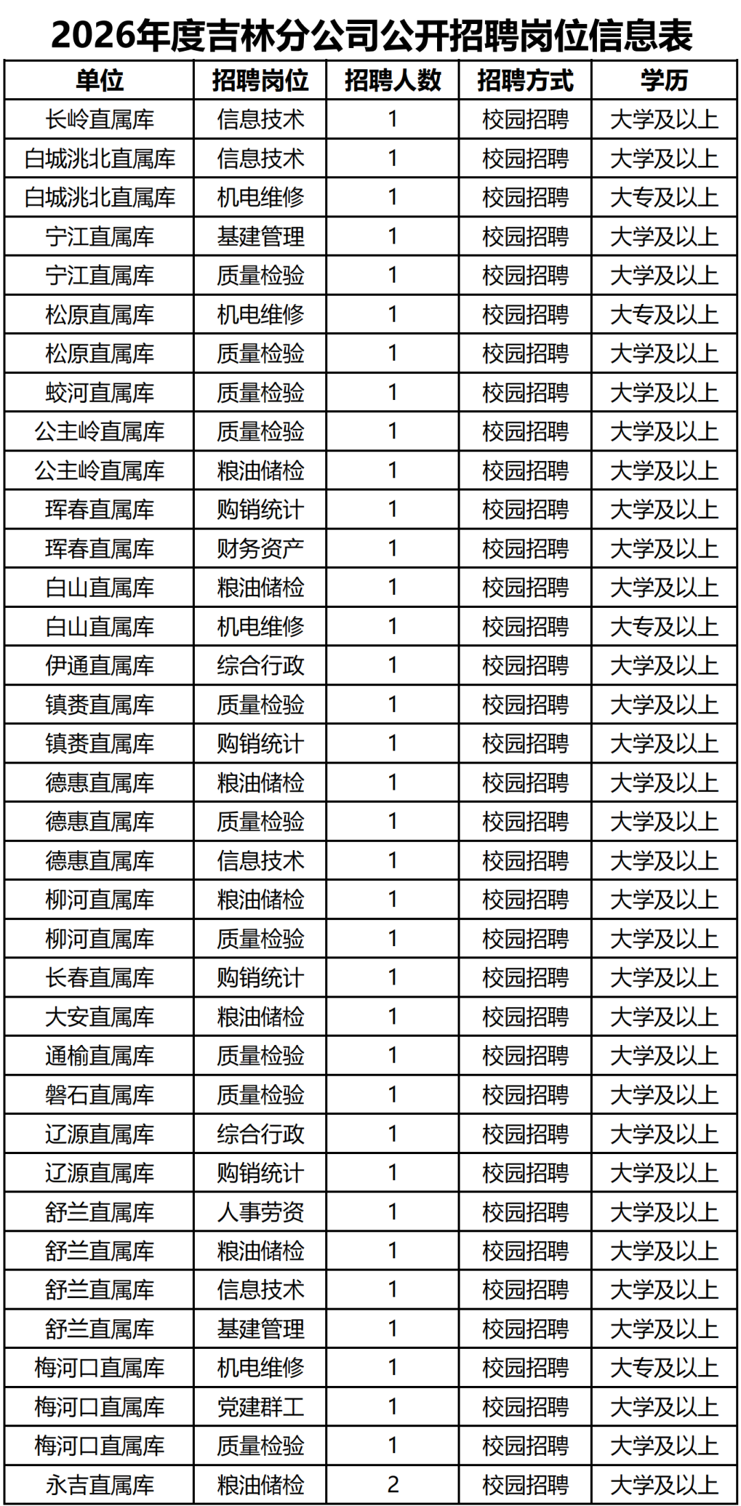 本次招聘为中国储备粮管理集团有限公司吉林分公司辖区直属企业岗位,计划招聘62人,面向2026届应届毕业生和2025届未落实工作单位,其户口、档案、组织关系仍保留在原毕业学校,或者保留在各级毕业生就业主管部门(毕业生就业指导服务中心)、各级人才交流服务机构和各级公共就业服务机构的毕业生,以及回国(境)后初次就业且具有教育部留学服务中心派遣资格的国(境)外留学生(2025年1月1日至面试前取得国(境)外学位并完成教育部留学服务中心学历学位认证)。