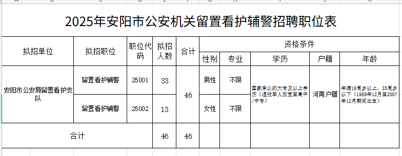 安阳市公安局留置看护支队招聘看护辅警46人(招聘职位及有关要求见附件)。