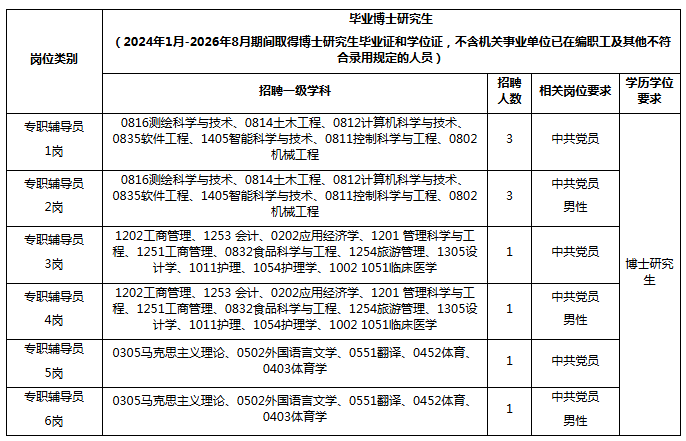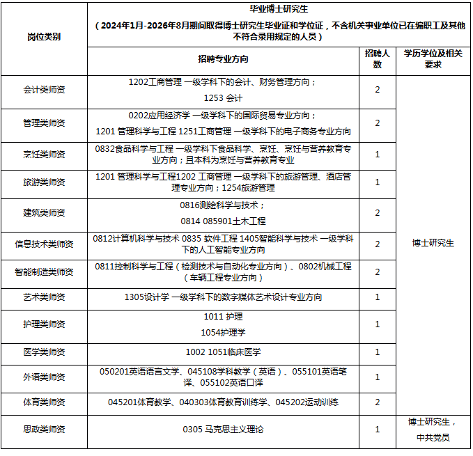 5.具有招聘岗位所需的学历、专业条件。其中,学历为国家教育行政主管部门认可的研究生以上文化程度;国(境)内院校培养研究生所学的学科及代码(上表所列)以国务院学位委员会、教育部《研究生教育学科专业目录(2022年)》为准;留学归国等应聘人员所学学科专业与资格条件要求的学科专业相近但不在选定参考目录的,由我校结合所学课程等进行审查。毕业证、学位证及相关认证证书应为2024年1月1日-2026年8月31日期间取得。