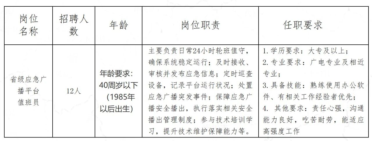 山西省应急广播平台即将投入试运行,山西省广播电视局中波台管理中心现有人员编制难以满足工作需求。为确保应急广播平台正常运行,依据国家及地方关于事业单位临时用工管理相关规定,通过规范流程招募临时用工人员,为省级应急广播平台运营提供有力的人力支持。