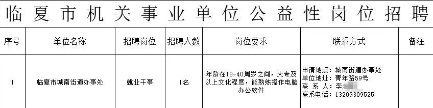 为促进就业困难人员就业,充分发挥公益性岗位托底安置作用,根据州人社局、州财政局《关于印发临夏州公益性岗位开发管理工作实施细则的通知》(临州人社通〔2020〕105号)等有关文件规定及工作需要,现面向社会公开招聘城镇公益性岗位人员。
