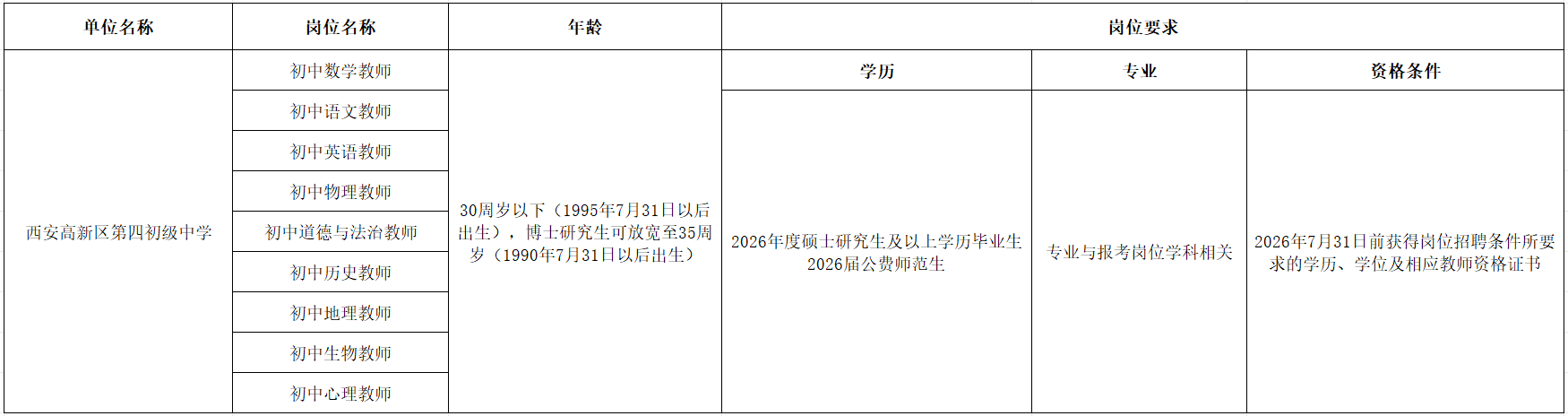 为加强我校教师队伍建设,切实做好学校教师队伍配备,西安高新区第四初级中学面向2026年应届毕业生公开招聘各学科教师。