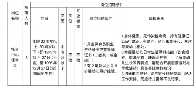 本次计划拟招聘托育中心保育员3名,具体招聘条件如下: