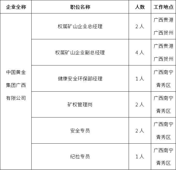 根据发展规划与高质量发展需要,中国黄金集团广西有限公司发布招聘公告,面向社会招聘一批业务骨干人员,公告如下。