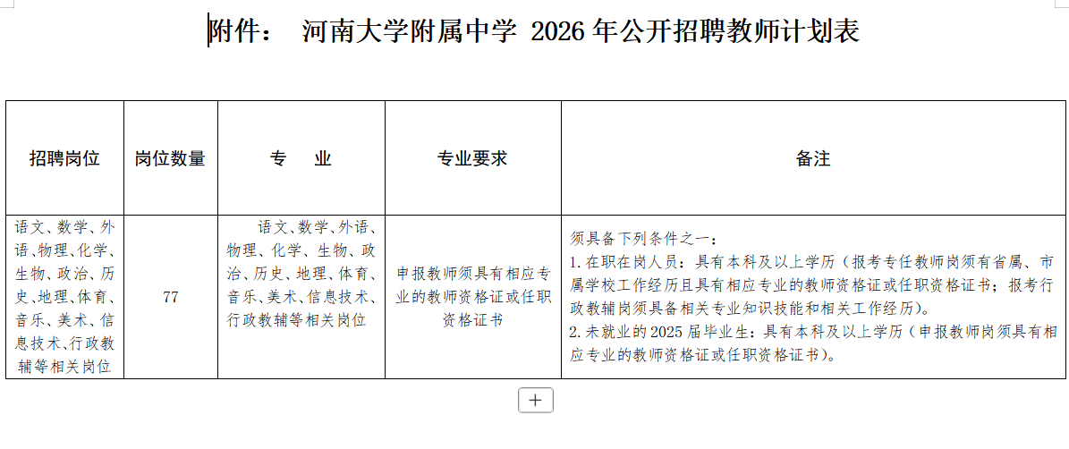 见附件《河南大学附属中学公开招聘教师计划表》