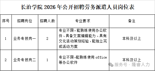 长治学院2026年公开招聘劳务派遣岗位工作人员3名,招聘岗位所需的具体条件以《长治学院2026年公开招聘劳务派遣人员岗位表》(见附件)的要求为准。