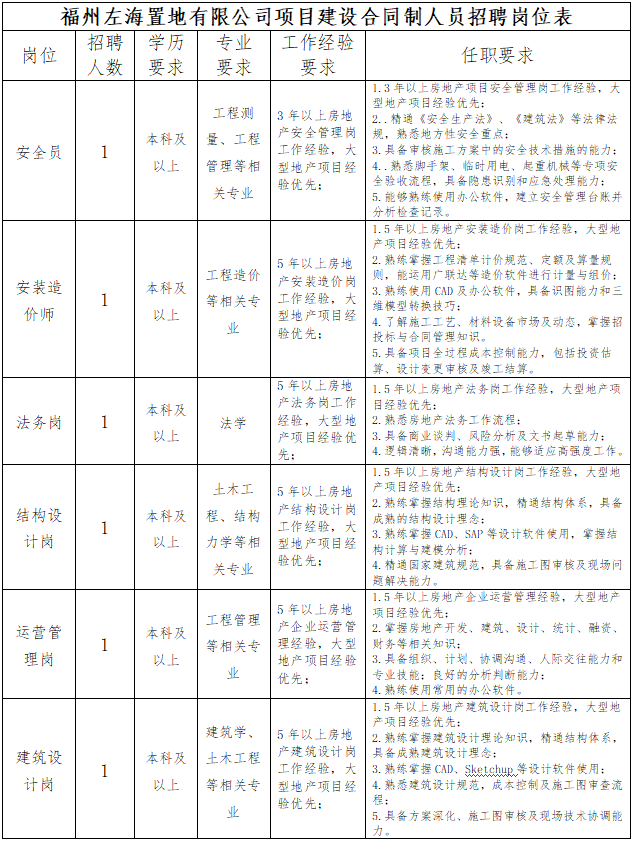 福州左海置地有限公司为福州工业园区开发集团有限公司全资子公司,经营范围包括房地产开发经营,同时涵盖非居住房地产租赁、住房租赁、物业管理、园区管理服务等业务。因业务发展需要面向社会公开招聘专业人才,现将有关事项公告如下: