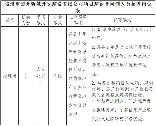 福州市园开新筑开发建设有限公司为福州工业园区开发集团有限公司全资子公司,经营范围包括房地产开发经营、住房租赁、非居住房地产租赁、办公设备租赁服务、物业管理、物业服务评估等。因业务发展需要,公开招聘如下岗位(详见招聘岗位表附件1),现将有关事项公告如下: