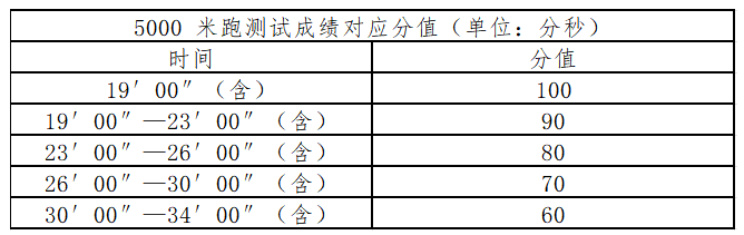具体时间、地点、要求以《体能测试通知单》为准,考试项目为5000米长跑,满分为100分。