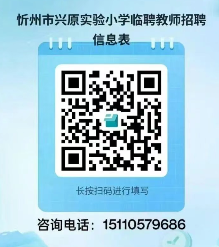 3. 凡参加面试者,需持身份证、教师资格证、毕业证、普通话合格证原件及复印件,现场进行资格审核,自带四、五年级教材。扫码填写并打印《忻州市兴原实验小学应聘教师信息表》