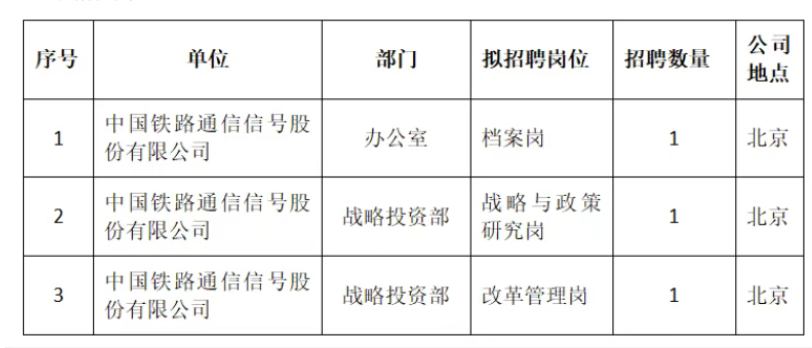 根据工作需要,现在全社会范围内公开招聘中国铁路通信信号股份有限公司总部相关工作人员,具体情况如下: