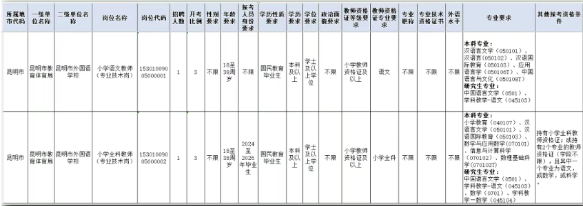 昆明市外国语学校2026年面向社会公开招聘小学部教师2人。