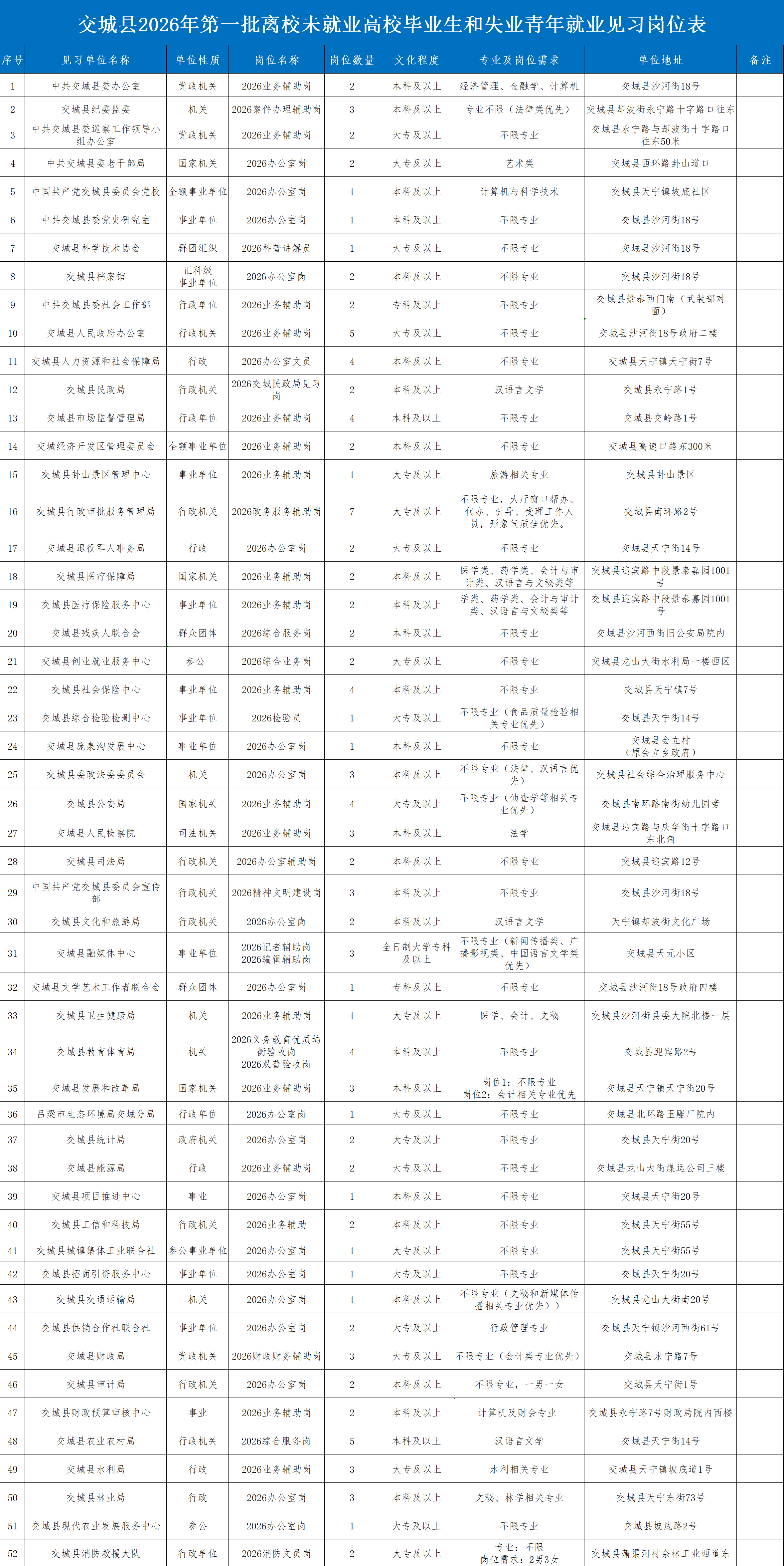 交城县2026年第一批离校未就业高校毕业生和失业青年就业见习岗位数为52个岗位120名(岗位信息表见附件1)。