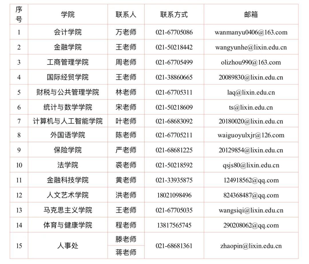 相关学院及人事处联系方式