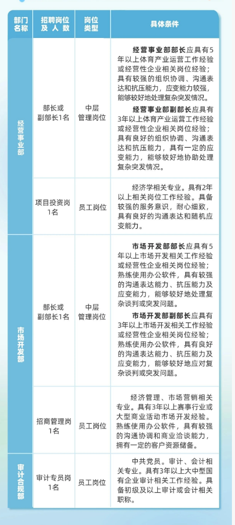 (三)报名中层管理岗位的年龄原则上不超过45周岁(1980年2月及以后出生),一般应具有大学本科及以上学历,体育经济与管理、工商管理、市场营销、旅游管理、新闻传播、人文教育等相关专业。