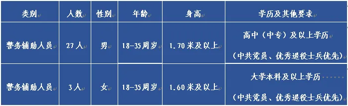 4、学历:男性警务辅助人员应具有国家承认的高中(中专)及以上学历。女性警务辅助人员应具有国家承认的大学本科及以上学历。