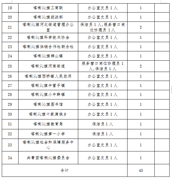 本次招聘办公室文员、服务窗口协理员、保洁员等45人。具体岗位及岗位条件详见《2026年喀喇沁旗第一批公益性岗位需求情况表》。