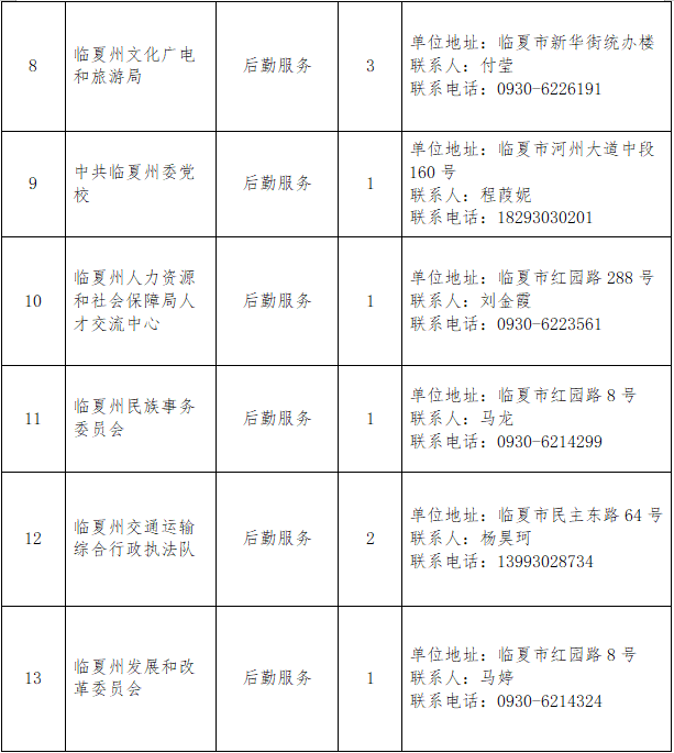 4.联系人:各机关事业单位联系人(详见临夏州本级2026年第一批公益性岗位需求表)