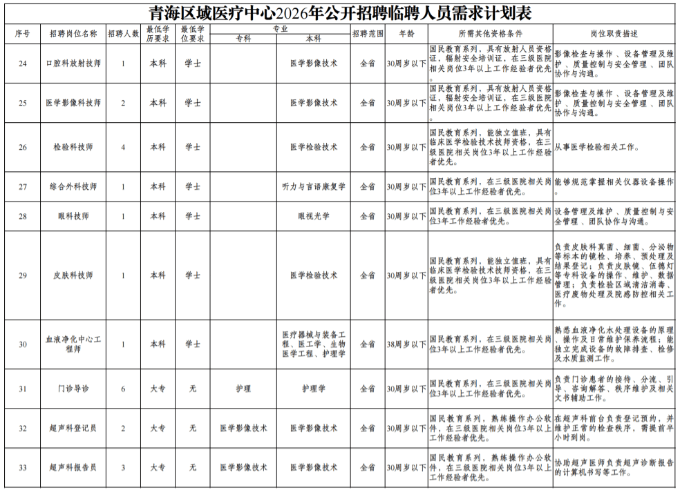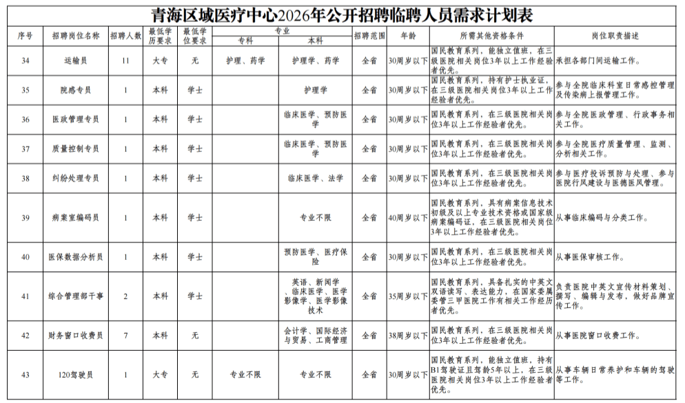符合招聘条件的考生均可报名应聘,具体岗位、人数详见《青海区域医疗中心2026年公开招聘临聘人员需求计划表》。