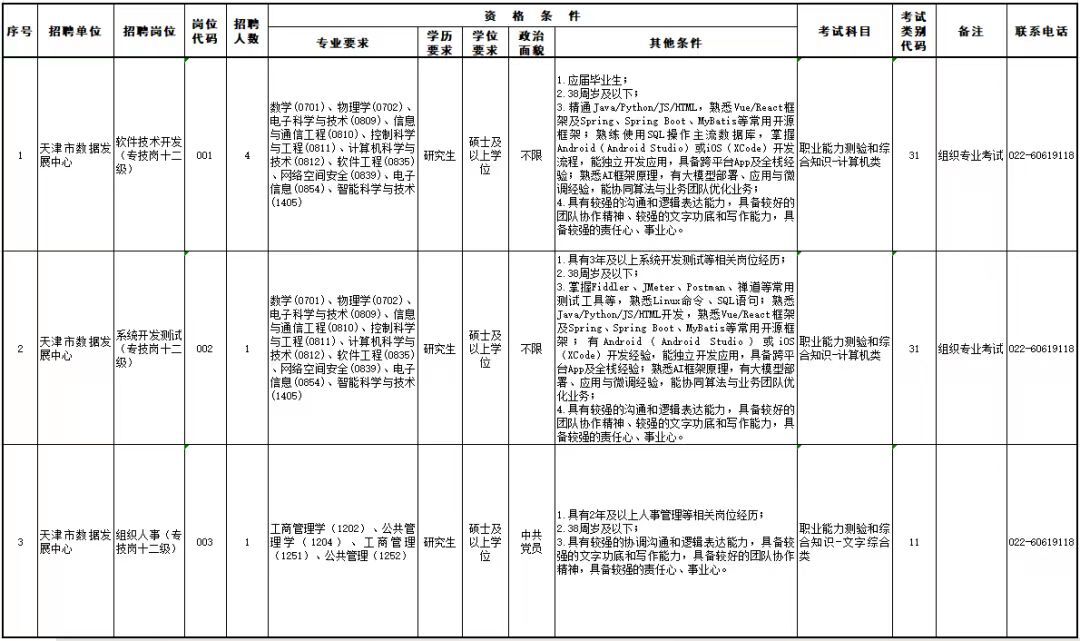 本次公开招聘设置招聘岗位共计3个,均为专业技术岗,计划招聘工作人员共计6名,具体详见《2026年天津市数据发展中心公开招聘工作人员计划表》。