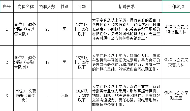 根据《广西壮族自治区公安机关警务辅助人员条例》《崇左市公安机关警务辅助人员招聘管理办法(试行)》,结合工作需要,凭祥市公安局决定面向社会公开招聘33名警务辅助人员(以下简称辅警)。现将有关事宜公告如下: