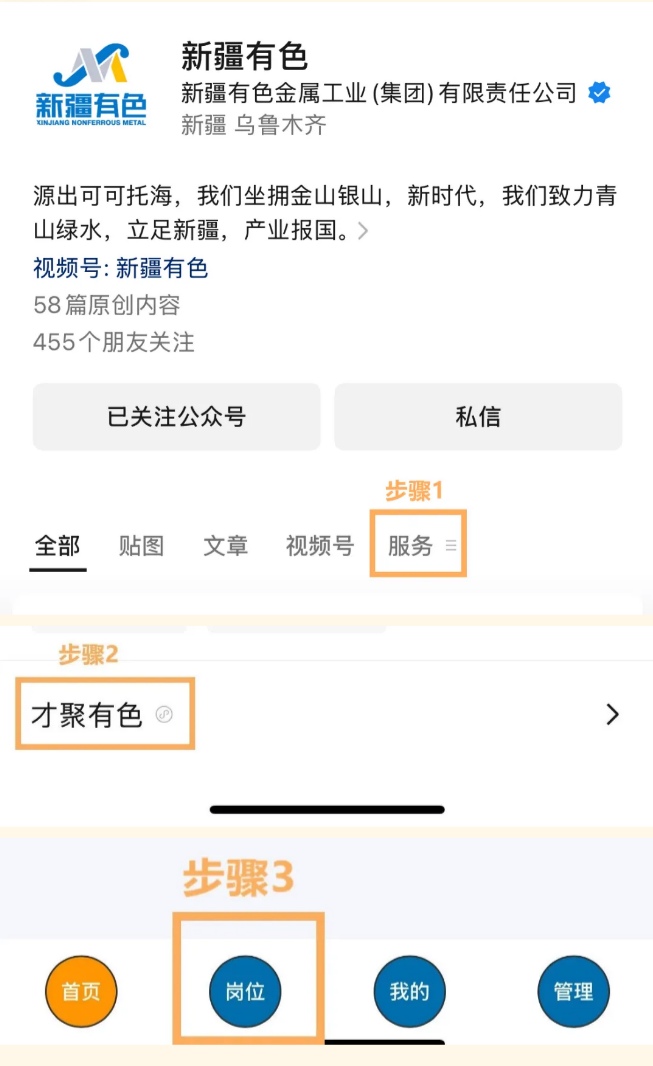 报名渠道及流程:在“新疆有色”微信公众号、新疆有色官网下载相关附件;随后点击“新疆有色”微信公众号主页菜单里的“服务”,进入“才聚有色”子菜单,再点击小程序页面下方“岗位”,进入选择对应岗位,上传应聘登记表、学历学位证书、职称/职业资格证书及相关业绩证明材料。