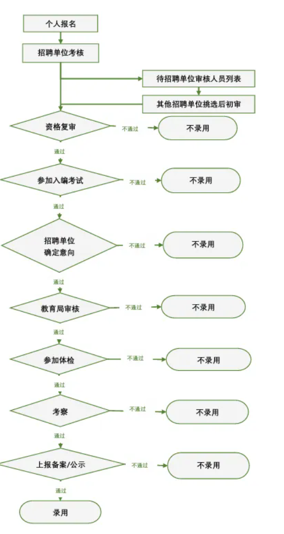招聘单位对应聘人员进行资格初审。对资格初审通过的人员,招聘单位安排面试、试讲、笔试等考核。招聘单位的考核方案须交主管部门核准备案。考核通过的应聘人员一般按岗位需求数1:3的比例由招聘单位择优推荐参加统一的进编考试。具有高级教师职称的应聘人员经招聘单位考核后报区教育局审核备案。