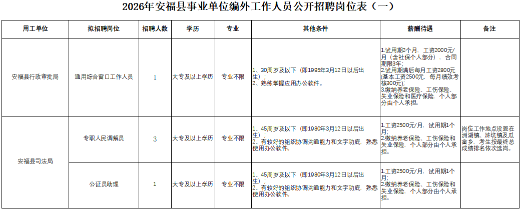 附件:《2026年安福县事业单位编外工作人员公开招聘岗位表(一)》