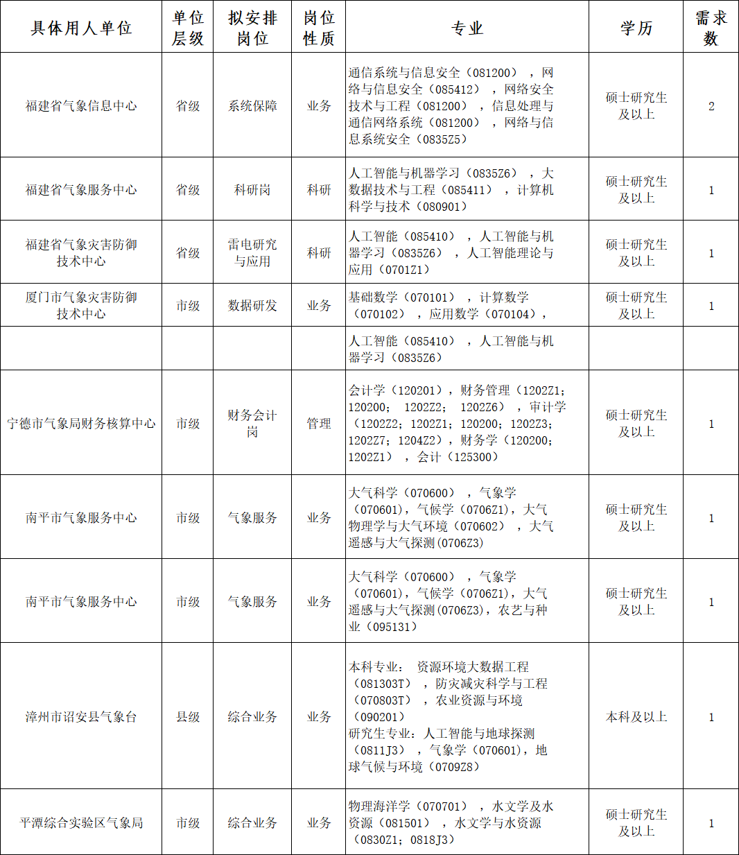 南平市气象服务中心气象服务岗位(专业:大气科学(070600),气象学(070601),气候学(0706Z1),大气遥感与大气探测(0706Z3),农艺与种业(095131)),硕士研究生及以上,工作地点:南平生态与农业气象试验站,地点武夷山。