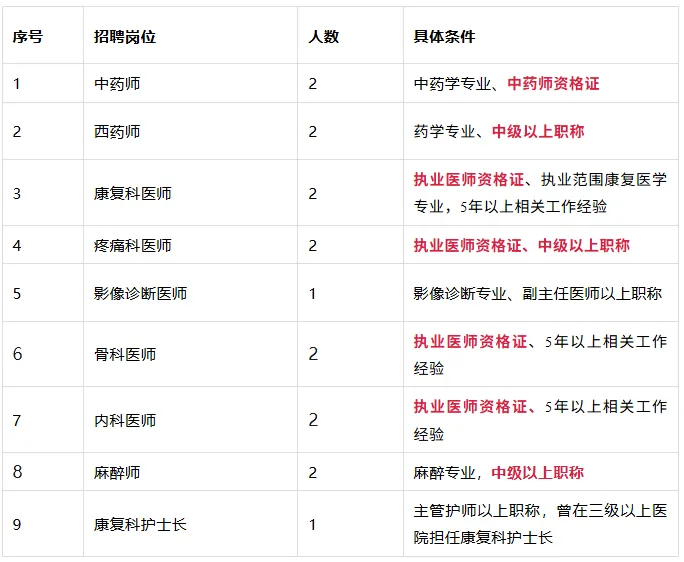 现因医院业务发展需要,招聘以下专业人才: