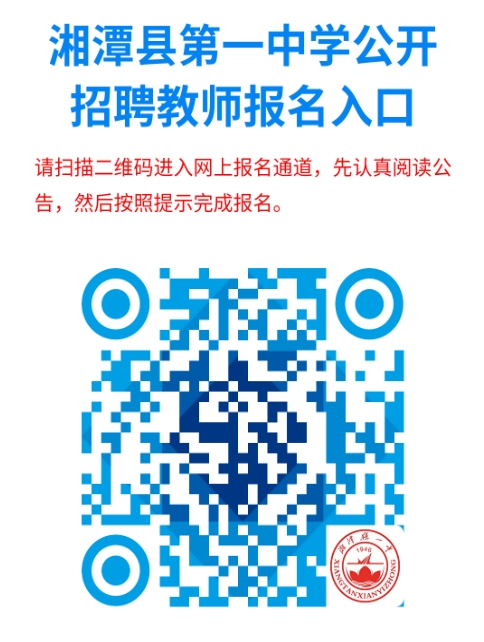 2.报名方式:采取网上报名方式。在报名时间内应聘人员登录湘潭县第一中学校园网(http://www.xtxyz.com)或“湘潭县第一中学”微信公众号,扫描“湘潭县第一中学2026年公开招聘教师报名二维码”,下载并填报《湘潭县第一中学2026年公开招聘教师报名登记表》(详见附件3,以下简称“《报名登记表》”),上传资料完成报名,不接受其他形式报名。