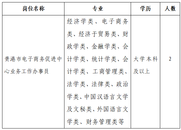 (三)报名方式:(1)网上报名。请报名者将相关材料扫描或拍照(面试时带原件核验)发送到电子邮箱:ggswj866@163.com,材料名称统一以“所报岗位名称+本人姓名”形式标注。(2)现场报名。请报名者携带相关材料到贵港市商务局3楼302办公室报名。(联系电话:0775—2933681)