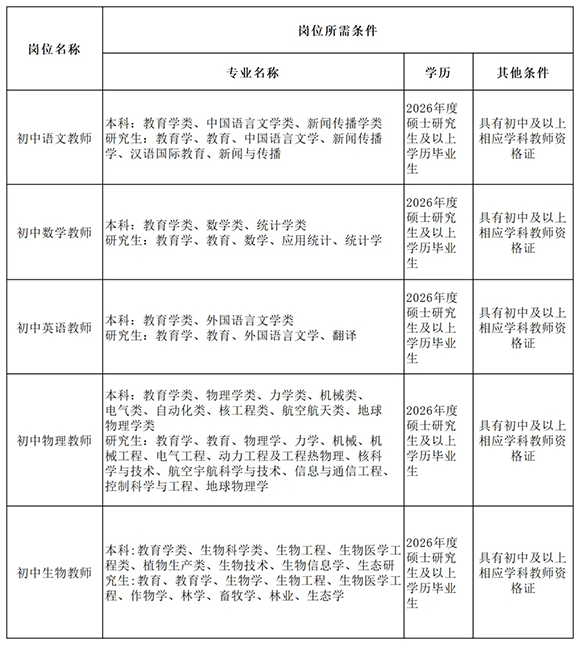 为进一步加强我校教师队伍建设,充实教师队伍力量,优化教师结构,拟对外公开招聘语文、数学、英语、生物、物理学科教师,具体岗位如下:
