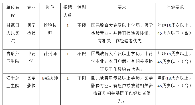 为进一步推进深化医药卫生体制改革,切实加强医疗卫生人才队伍建设,根据我县域医共体成员单位医务人员总量配备管理办法及工作实际需要,现面向全省公开招聘甘德县域医共体总院编外专业技术人员3人,现将有关事项公告如下: