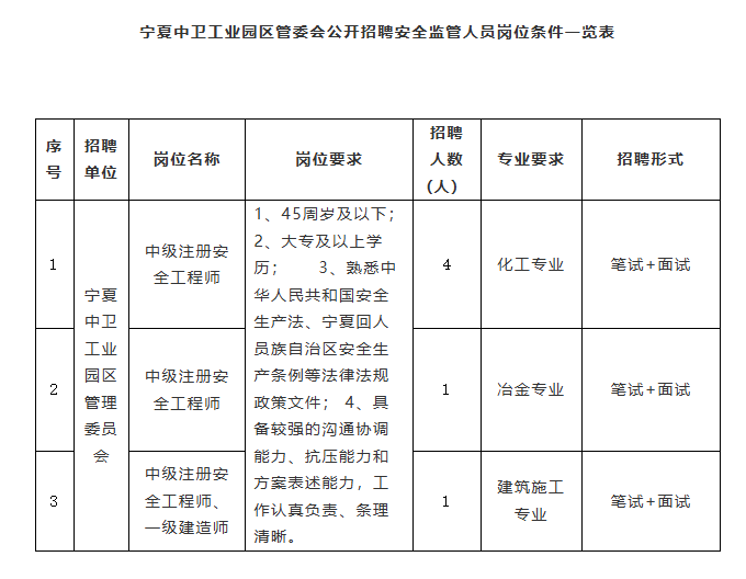 本次招聘宁夏中卫工业园区安全监管人员6人。